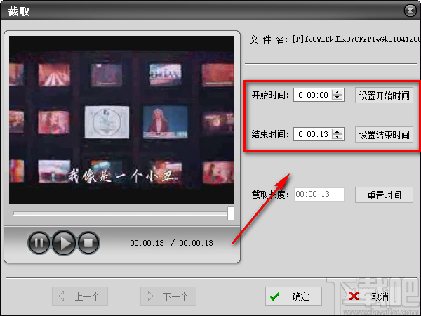 4.在截取页面中,我们在页面右侧找到“开始时间”和“结束时间”选项,根据自己的需要,分别点击这两个选项后面文本框中的上下按钮对截取时间进行设置。