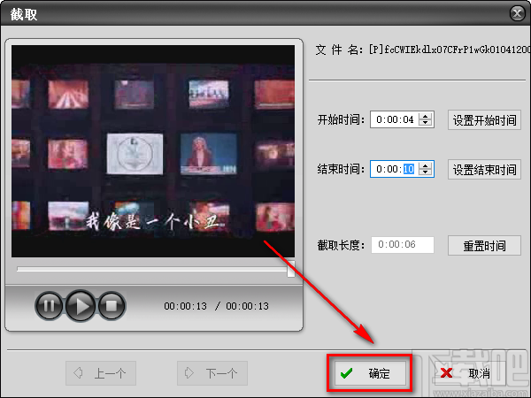5.剪切视频的起始时间设置完毕后,我们在页面右下角找到“确定”按钮,点击该按钮就可以回到软件界面上。