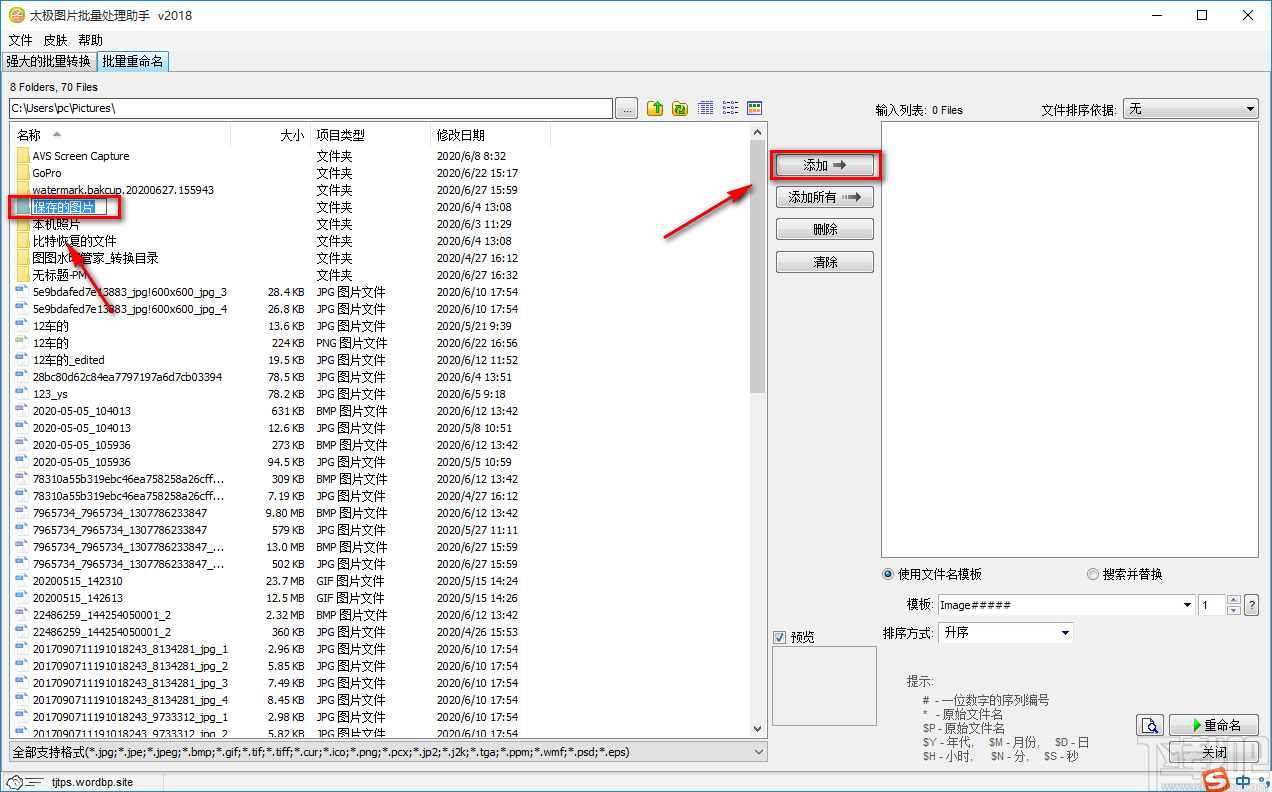 3.接着在界面左侧找到需要更名的图片所在文件夹,再点击界面中上方的“添加”按钮即可将文件夹添加到右侧的输入列表中。