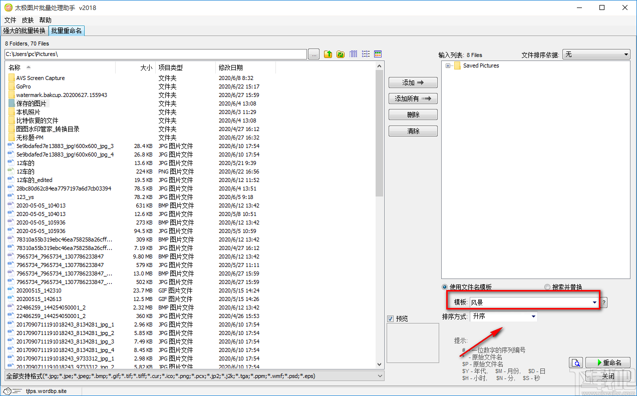 4.接下来在界面右下方找到“模板”选项,该选项后面有一个模板文本框,我们可以点击文本框下拉框,并根据自己的需要在下拉框选择文件名模板;也可以在文本框中直接输入文件名模板。