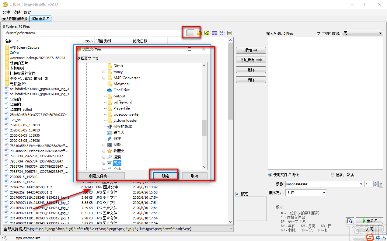 2.在批量重命名页面中,我们在界面上方找到一个三个小点按钮,点击该按钮会有一个文件路径选择页面出现在界面上;我们在该页面中选中需要更名的图片所在的源文件夹后,再点击页面右下角的“确定”按钮即可。