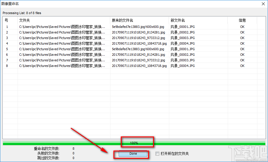 8.最后界面上会弹出一个图像重命名窗口,我们可以在窗口底部查看到重命名的完成情况是100%;之后点击窗口底部的“Done”按钮即可完成全部的操作步骤。