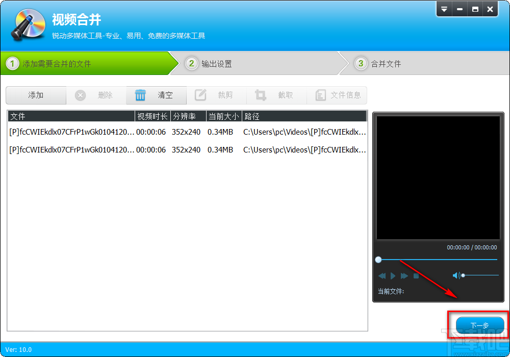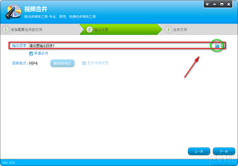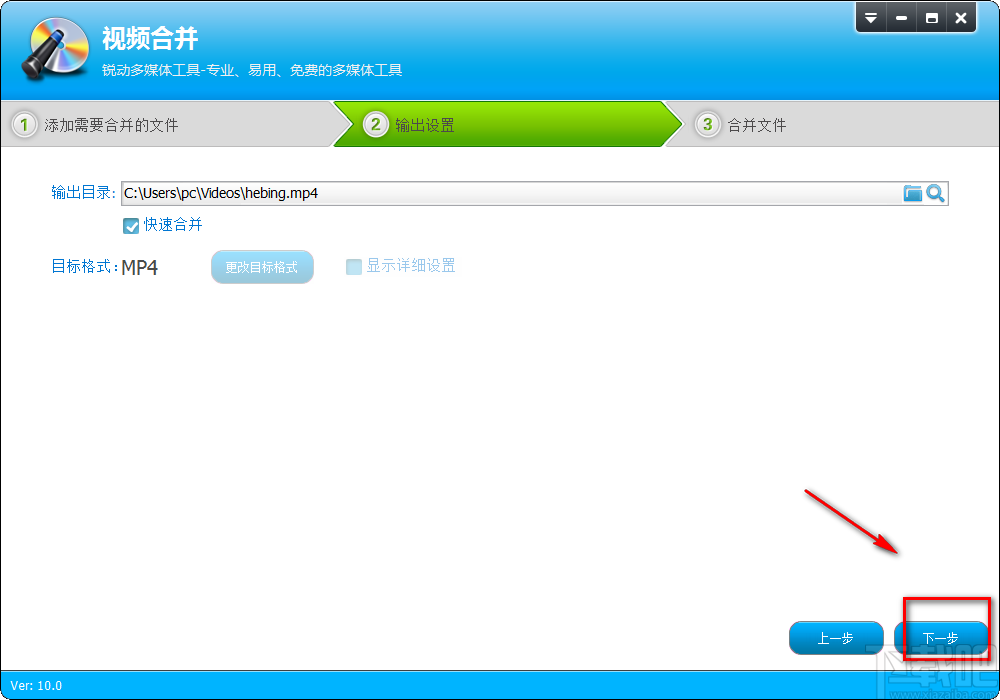 7.接着在输出目录页面的右下角找到蓝色的“下一步”按钮,点击该按钮就可以开始合并视频的工作了。