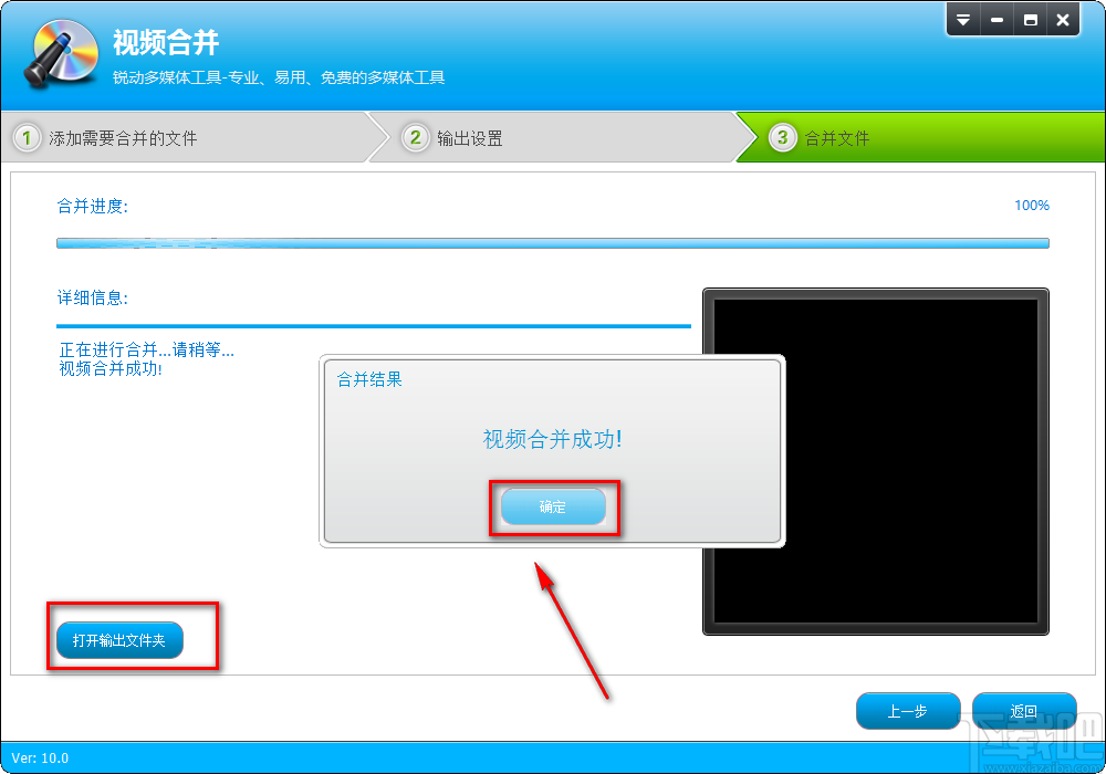 8.合并视频的速度非常快,视频合并成功后,界面上会弹出一个“视频合并成功”的提示框,我们点击框中的“确定”按钮即可完成全部的操作步骤;同时还可以点击页面左下角的“打开输出文件夹”按钮将存放目录打开并查看文件。