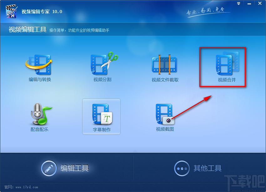 视频编辑专家是一款非常专业的视频编辑处理软件,该软件界面十分大气,所有的软件功能都显示在界面上,给用户提供了视频转换、视频分割、视频截图等功能,功能非常齐全。合并视频是视频后期处理内容之一,因为我们所看到的电影、电视剧或者综艺节目,都是由无数个小视频合并成一个完整的视频再呈现给观众的。这款软件就可以帮助我们合并视频,而且操作方法非常简单,那么接下来小编就给大家详细介绍一下视频编辑专家合并视频的具体操作方法,有需要的朋友可以看一看。