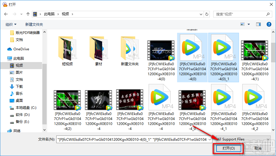 3.在文件添加页面中,我们找到需要合并的视频文件后,再点击页面右下角的“打开”按钮即可将文件添加到软件中。