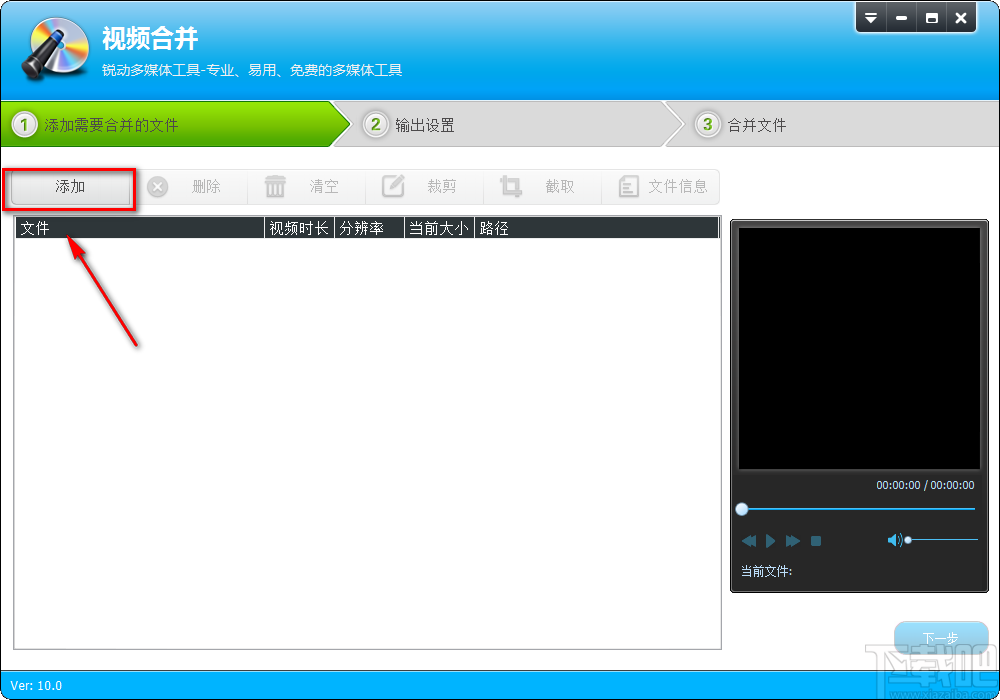 2.在视频合并页面中,我们在页面左上方找到“添加”按钮,点击该按钮进入到文件添加页面。