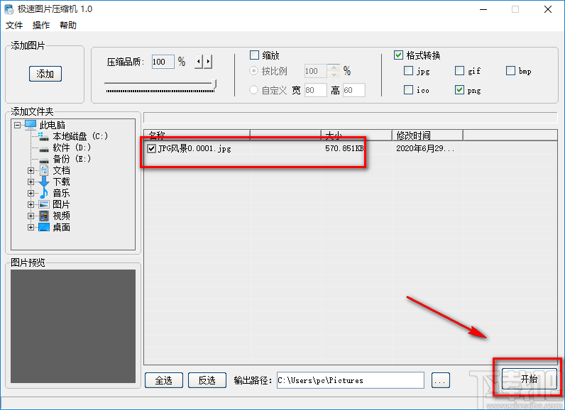 6.完成以上所有步骤后,我们在界面上的文件列表中找到刚刚添加的文件,点击文件前面的小方框使其打钩,之后在右下角找到“开始”按钮,点击该按钮就可以转换图片的格式并将其保存到指定的文件夹中。