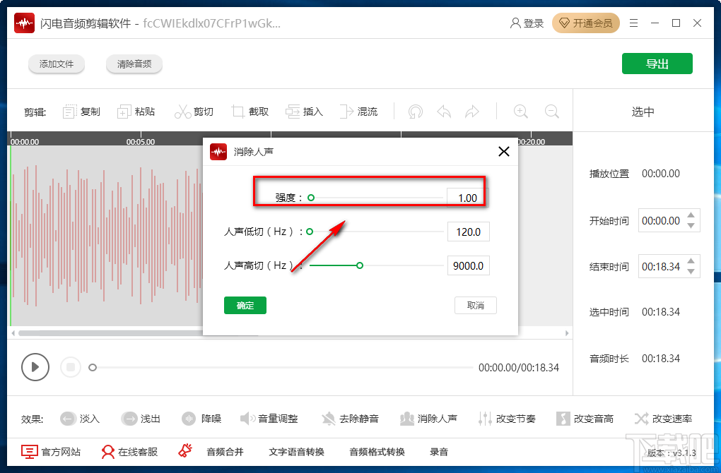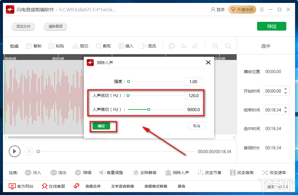 5.接下来在框中还可以找到“人声低切”和“人声高切”两个选项,我们按照第四步的方法对这两个参数进行设置,然后再点击框中左下角的“确定”按钮就可以对音频文件进行消除人声处理了。