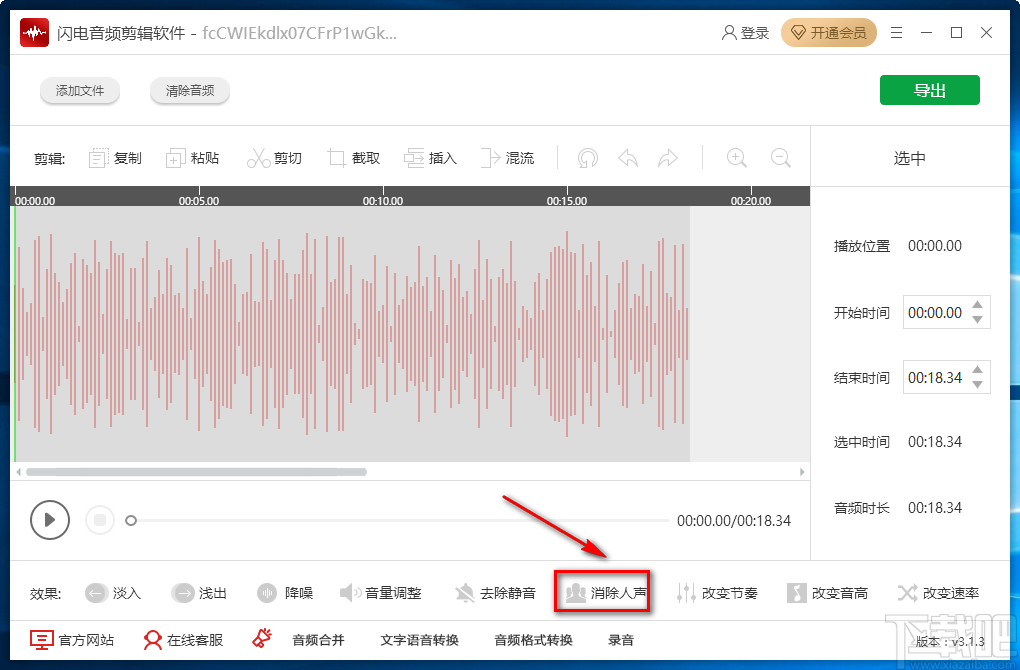 3.将文件添加到软件后,我们点击Ctrl+A键选中全部音频,再找到页面下方的“消除人声”选项并点击,页面上会出现一个消除人声框。