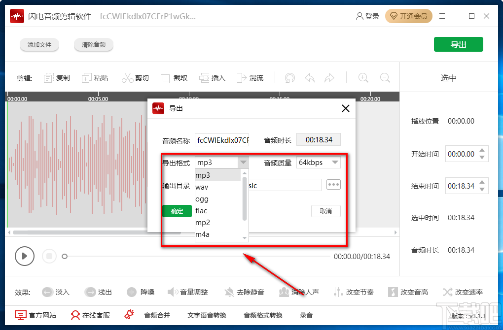 8.然后分别点击“导出格式”、“音频质量”下拉框,并根据自己的需要在下拉框中对这两个参数进行设置。