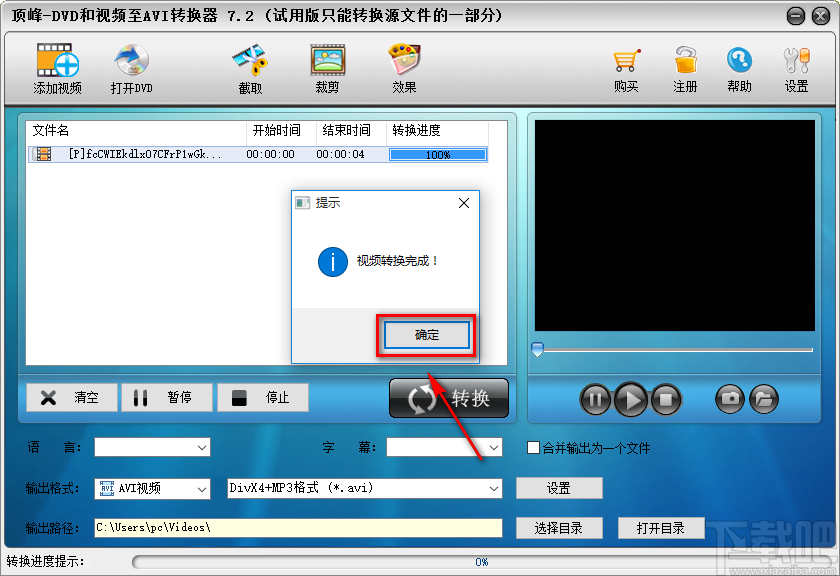 6.接着在界面左下方找到“输出格式”选项,因为小编添加到软件中的视频是AVI格式的,所以在这里点击该选项后面的第一个下拉框,并在下拉框中选择“AVI视频”。