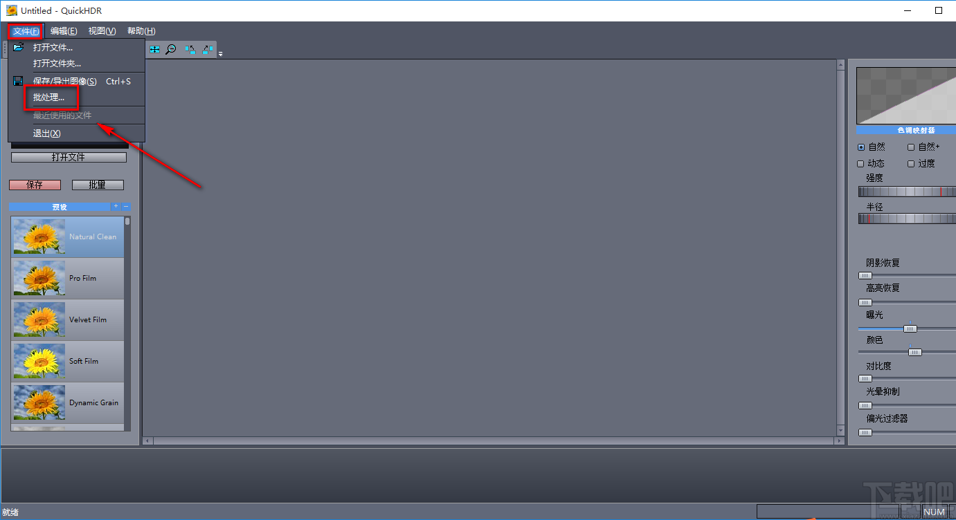 1.首先打开软件,在软件界面的左上角找到“文件”选项,点击该选项会出现一个下拉框,我们在下拉框中选择“批处理”并点击即可。