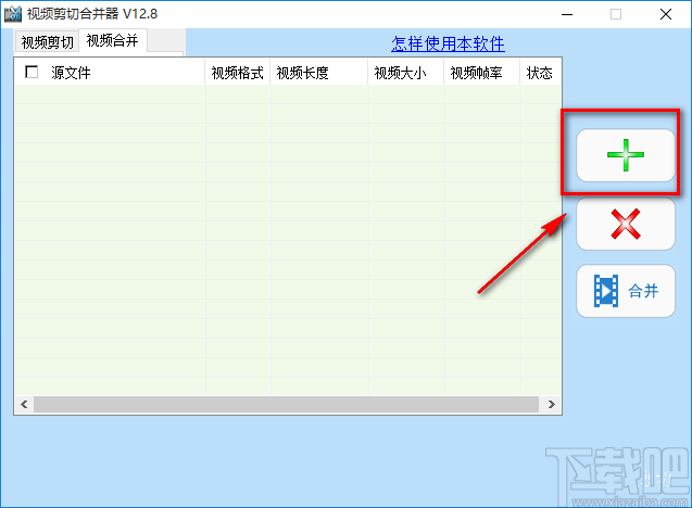 3.接着在视频合并页面右侧找到绿色的加号图标按钮,我们点击该按钮进入到文件路径选择页面。