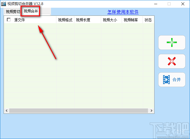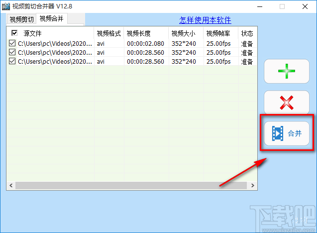 5.将视频文件添加到软件后,我们在页面右侧找到“合并”按钮,点击该按钮会弹出一个视频剪切合并器窗口。