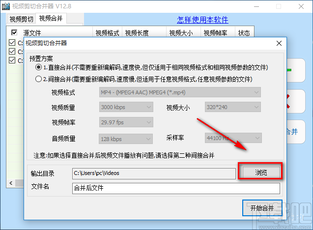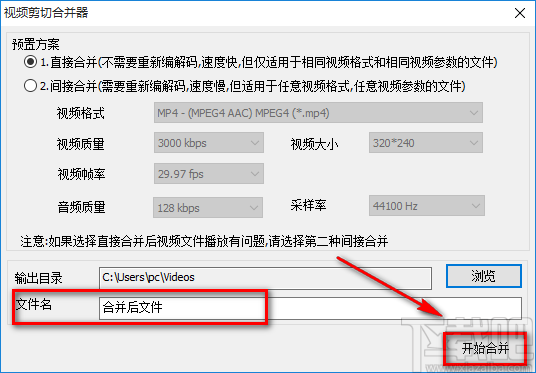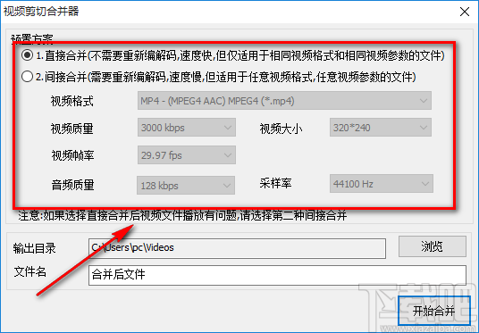 6.我们在窗口左上方找到“预置方案”选项,根据自己的需要在该选项下方对合并方式进行选择,小编在这里选择“直接合并”;如果选择“间接合并”,则还要在窗口中对视频格式、视频质量、音频质量、采样率等参数进行设置。