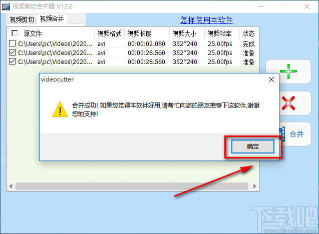 10.视频合并的速度非常快,视频合并完成后,界面上会弹出一个合并成功的提示框,我们点击框中的“确定”按钮可以打开文件的存放目录并查看文件。