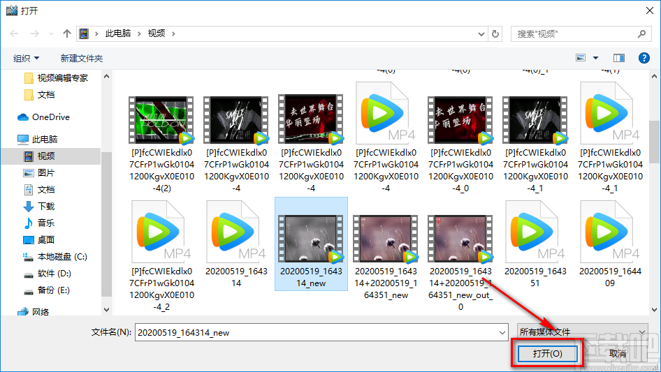 4.在文件路径选择页面中,我们找到需要合并的视频文件后,再点击页面右下角的“打开”按钮即可将文件添加到软件中后。