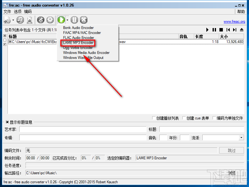 5.接着在界面左上方找到绿色的三角图标按钮,点击该按钮会有一个下拉框出现,我们在下拉框中选择“LAME MP3 Encode”选项,该选项表示转换为MP3格式;最后点击该选项就可以成功转换音频格式并将其保存到指定的文件夹中。
