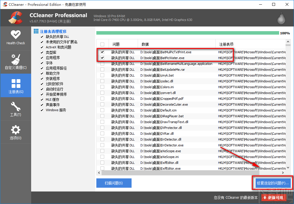 4.接下来在界面右侧的注册表问题列表中找到需要修复的注册表并勾选,然后再点击界面右下角的“修复选定的问题”按钮对注册表进行修复。