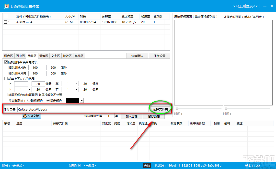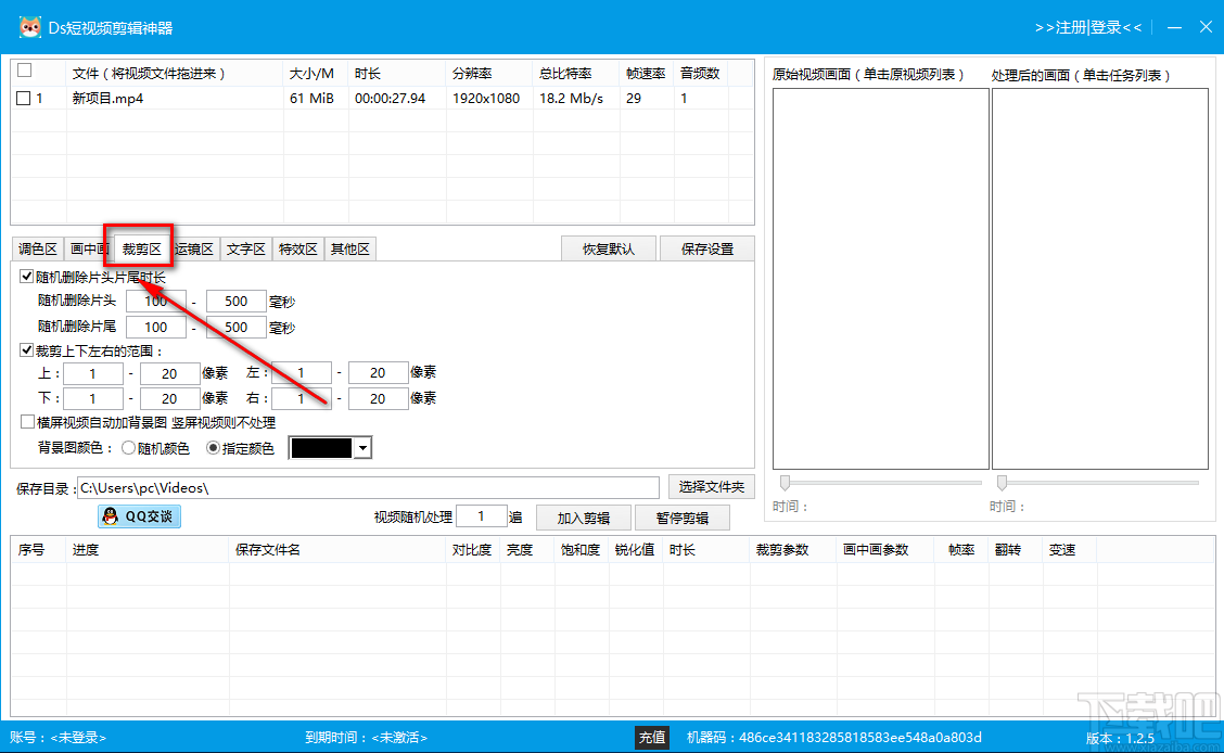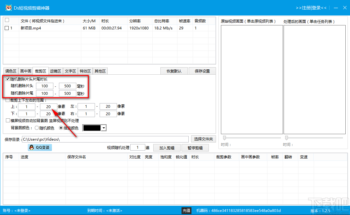 3.然后我们在裁剪区下方找到“随机删除片头片尾时长”选项,勾选该选项,并在其下方“随机删除片头”、“随机删除片尾”两个选项后面的本文框中输入需要删除片头和片尾的时长。