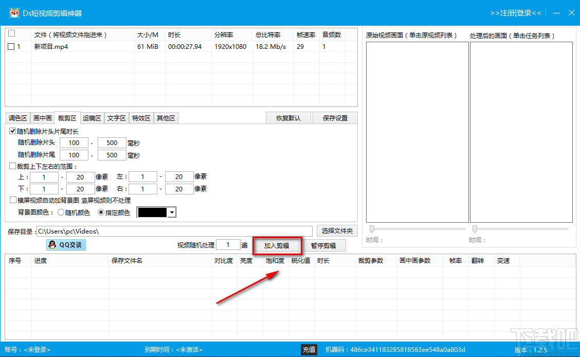 6.完成以上所有步骤后,我们在界面下方找到“加入剪辑”按钮,点击该按钮就可以开始删除片头片尾并将处理后的视频保存到指定的文件夹中。
