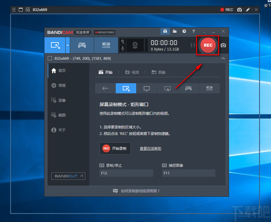 5.之后我们就可以看到录制区域被一个录屏框给框起来;接着在软件界面的右上角找到红色的“REC”按钮并点击,就可以开始录屏工作了。