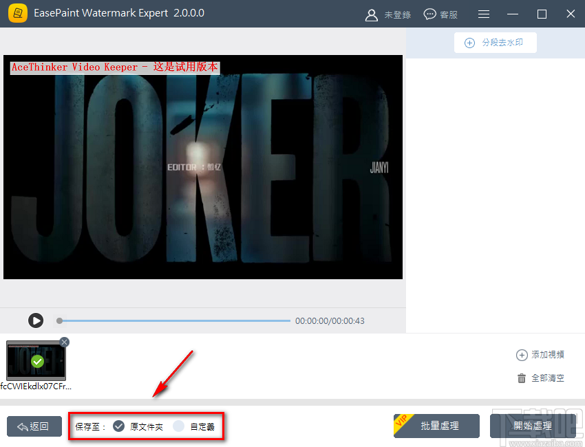 7.接下来在视频去水印页面的左下角找到“保存至”选项,我们根据自己的需要在其后面对文件保存位置进行选择,小编在这里选择“原文件夹”;如果选择“自定义”,则还要在弹出的文件保存路径选择页面中对文件保存位置进行选择。
