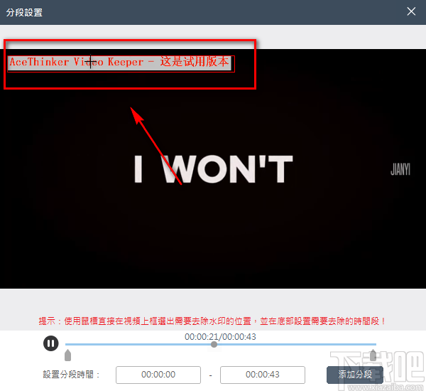 5.在分段设置页面中,我们将鼠标移动到视频预览框上,会发现鼠标变成了十字形鼠标,我们点击鼠标不动,将需要去除的水印部分框起来,然后会发现水印被一个红色矩形框框住。