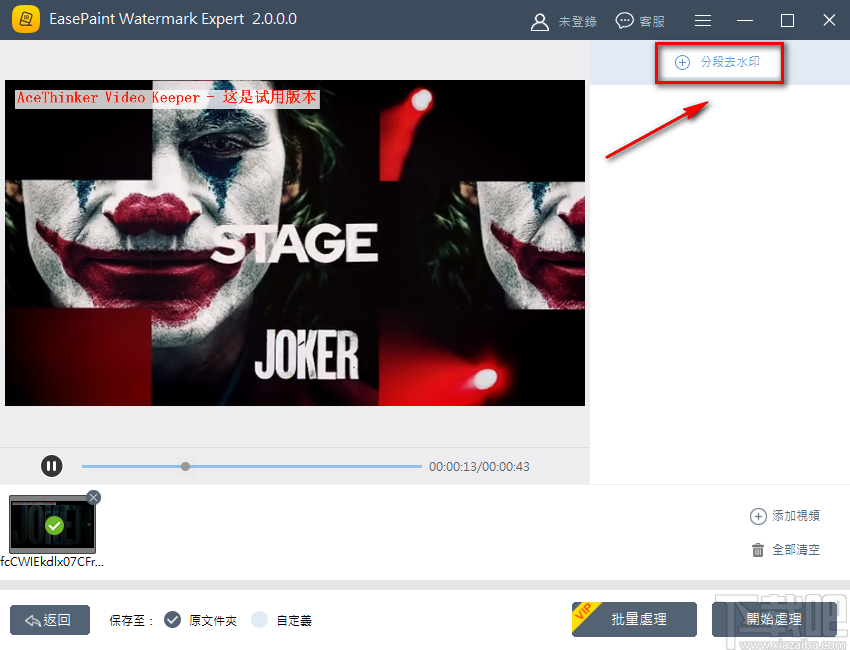 4.将文件添加到软件后,在页面右上角找到“分段去水印”按钮,我们点击该按钮会有一个分段设置页面出现。
