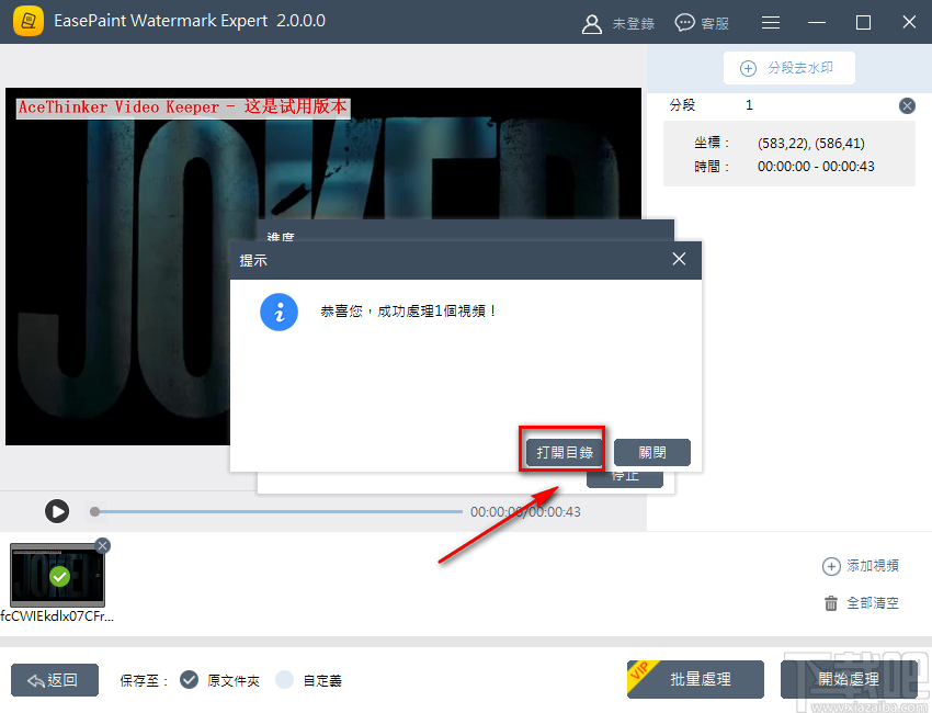 9.视频去水印的速度非常快,水印去除完毕后,界面上会弹出一个成功处理的提示框,我们可以点击框中的“打开目录”将存放目录打开并对文件进行查看。
