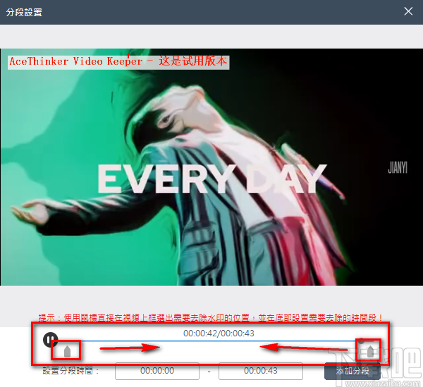 6.接着在页面下方找到时间进度条,进度条左右两端各有一个光标;我们向右移动进度条左边的光标使其到视频中水印去除的起始位置;再向左移动进度条右边的光标使其到视频中水印去除的终点位置;然后再点击页面右下角的“添加分段”按钮回到视频去水印页面。