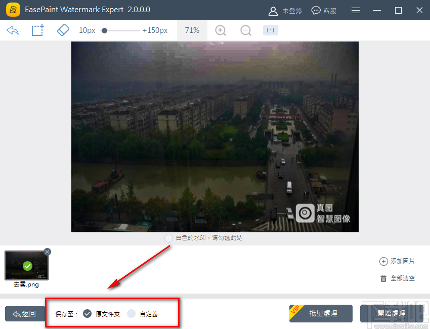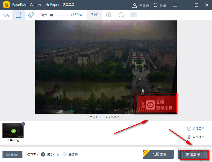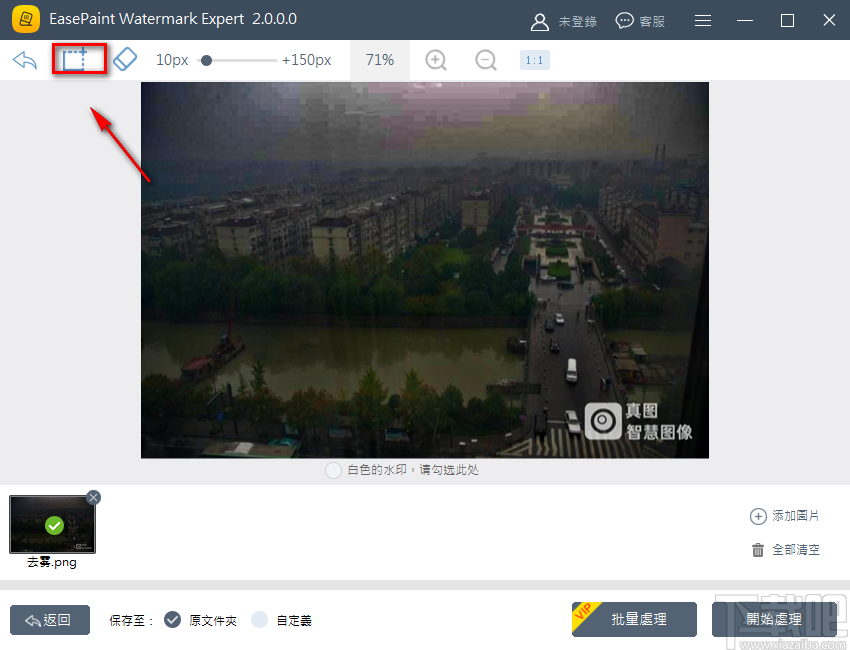 6.接着在图片上找到水印所在的位置,我们点击鼠标不动,将图片上的水印全部框住后再释放鼠标,随后在页面右下角找到“开始处理”按钮并点击,就可以开始去除水印的工作了。