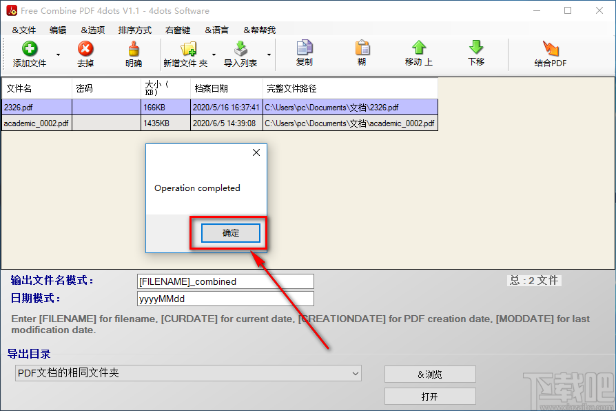 7.文件合并的速度非常快,文件合并完成后,界面上会弹出一个“Operaiton completed”提示框,表示任务已完成;我们点击框中的“确定”按钮可以打开文件存放目录并对文件进行查看。