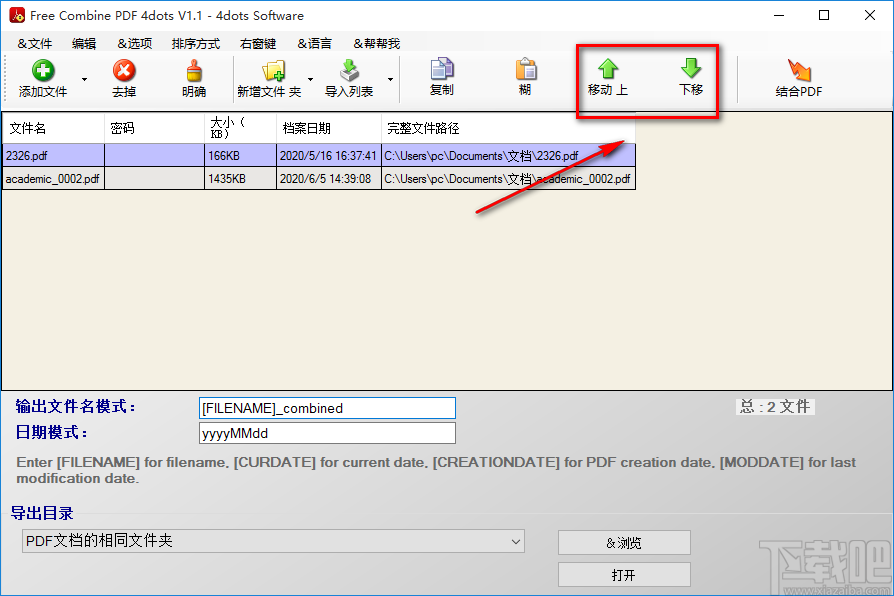 3.将文件添加到软件后,我们在界面右上方找到“移动上”、“下移”两个按钮,可以点击这两个按钮对文件合并的顺序进行调整。