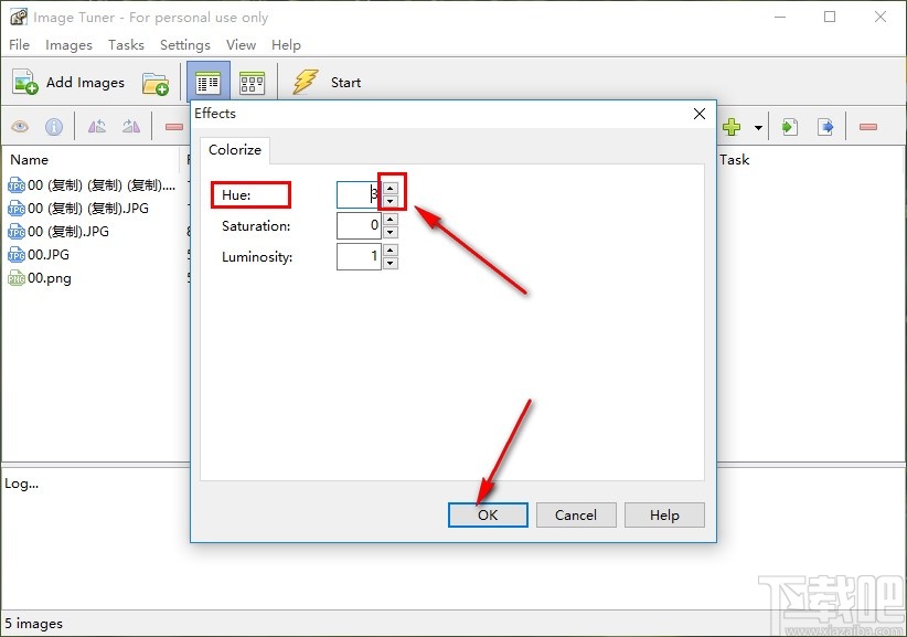 5.进入到色调调整界面之后,点击Hue色调选项后面的上下箭头就可以对色调参数进行调整了,调整之后点击下方的OK按钮保存参数设置。
