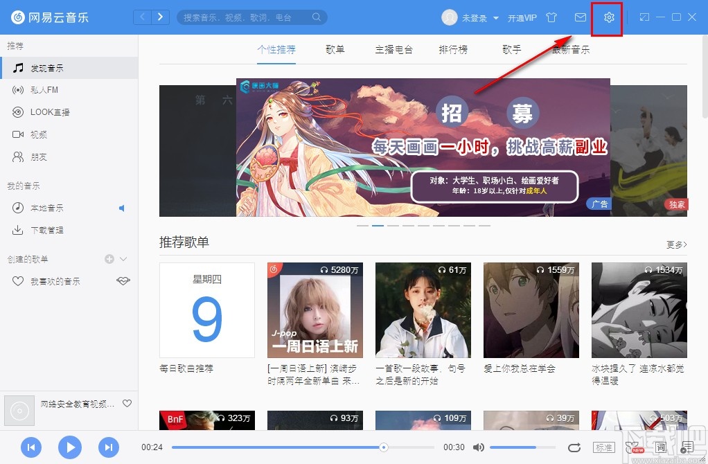 1.第一步我们在打开网易云音乐播放器之后,点击界面右上角的设置图标,如下图中所示。