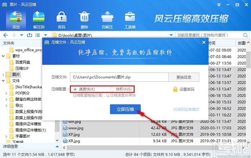 6.保存密码的设置之后,我们回到压缩文件界面,点击界面中的这个立即压缩按钮就可以开始加密压缩文件了。