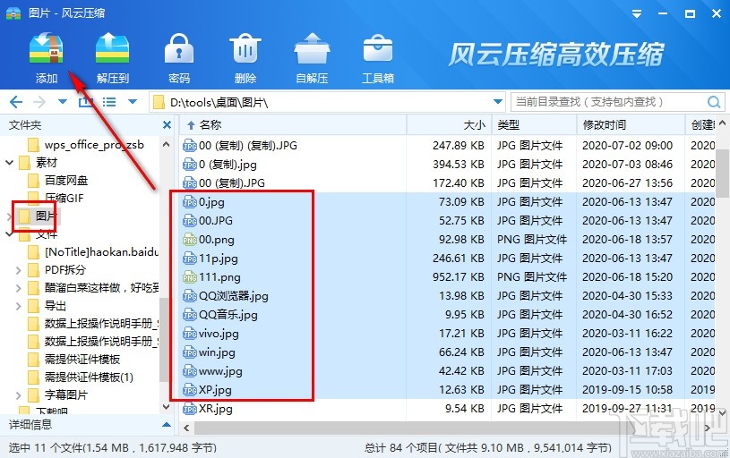 1.首先第一步我们打开软件之后,在左边点击文件夹,右边界面中就会显示文件夹中的所有文件了,我们根据自己的需求选中想要压缩的文件之后点击添加按钮。