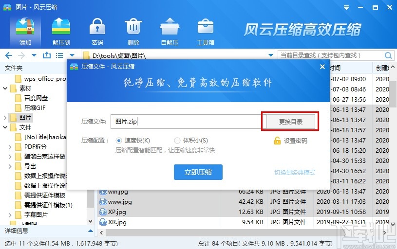 2.点击添加按钮之后就会打开压缩文件的界面,我们可以点击更换目录按钮来选择文件压缩的保存目录和设置压缩文件名称。