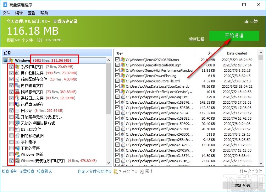 4.开始扫描之后我们等待扫描操作完成,然后在界面左边勾选扫描出来的一些文件选项,勾选之后点击右上方的开始清理按钮。