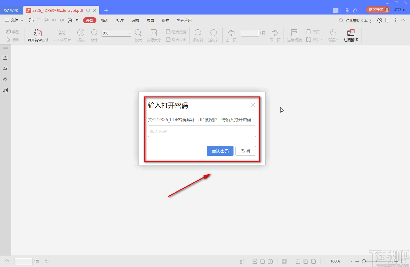 7.PDF文件加密后,再次打开该文件时,界面上会出现一个输入打开密码的窗口,我们需要在窗口中的文本框中输入正确的密码,再点击窗口中的“确认密码”按钮才能将PDF文件打开。