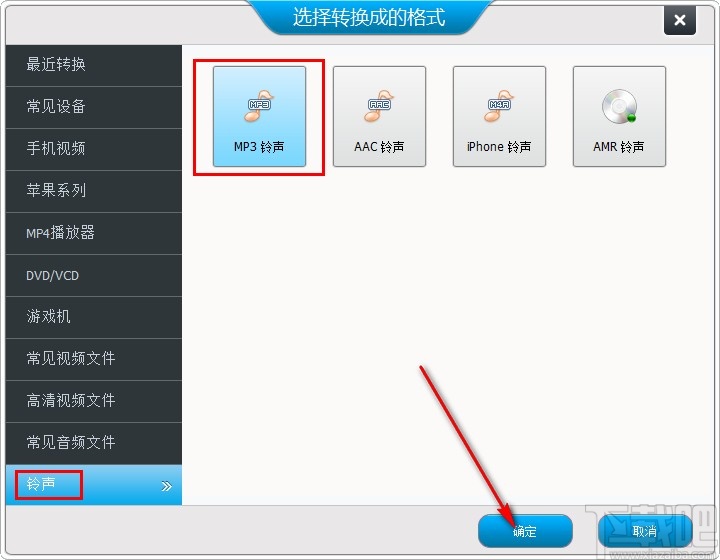 4.点击打开按钮将视频添加进来之后,下一步是需要选择想要转换成的格式,在界面左边选择铃声选项之后,点击MP3铃声类型,再点击下方的确定按钮。