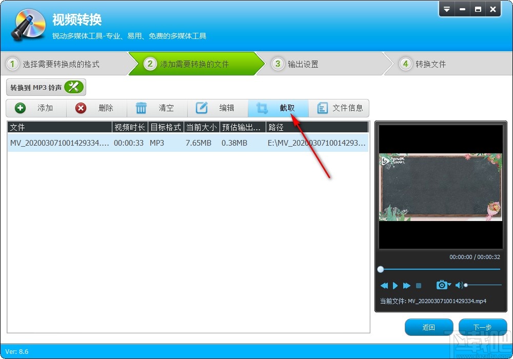 5.点击确定按钮之后成功添加视频文件,然后我们需要点击上方的截取这个功能,进入到截取铃声的界面中。