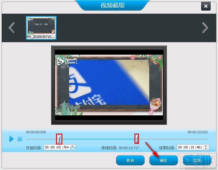 6.进入到截取铃声的界面之后,我们选中视频进度条左右两边的图标,移动选取想要转换为铃声的那一部分视频,然后点击确定按钮完成音乐截取。