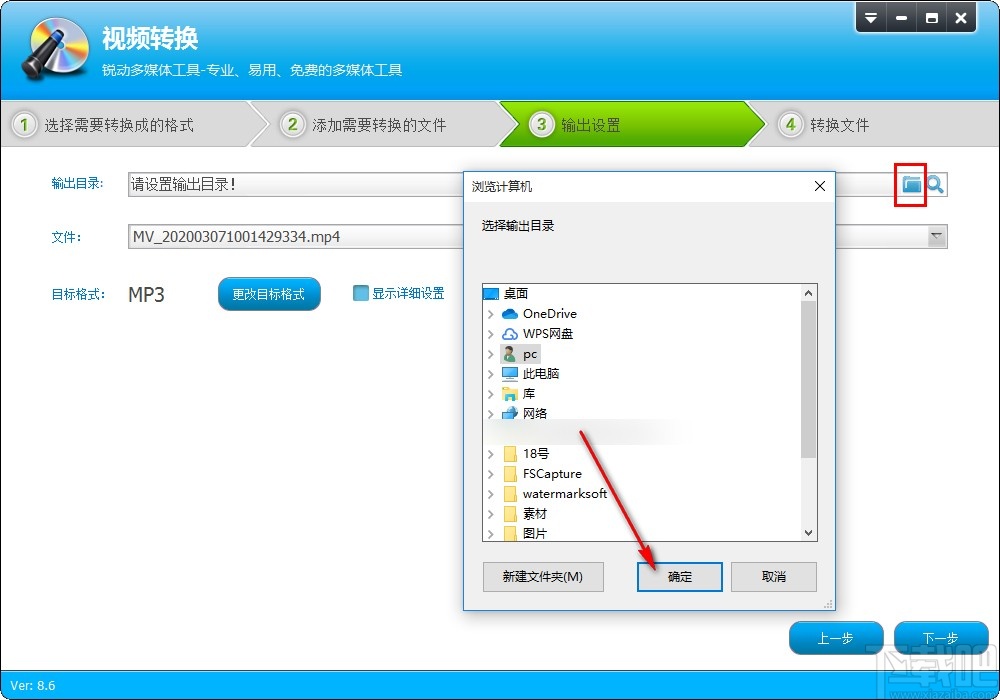 8.进入到输出设置界面之后,点击界面输出目录选项右边的文件夹图标,然后在出现的界面中选择输出保存路径之后,点击确定按钮即可。