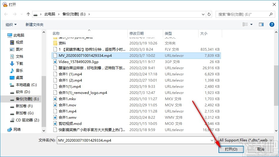 3.点击打开选择添加文件的界面之后,找到想要转换成铃声的视频选中之后点击右下角的打开按钮。