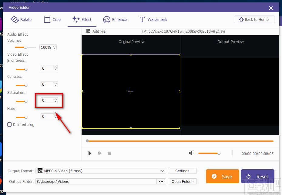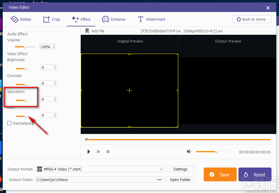 5.在“Saturation”选项后面还有一个文本框,我们可以根据自己的需要,点击文本框中的上下按钮对视频饱和度进行设置。