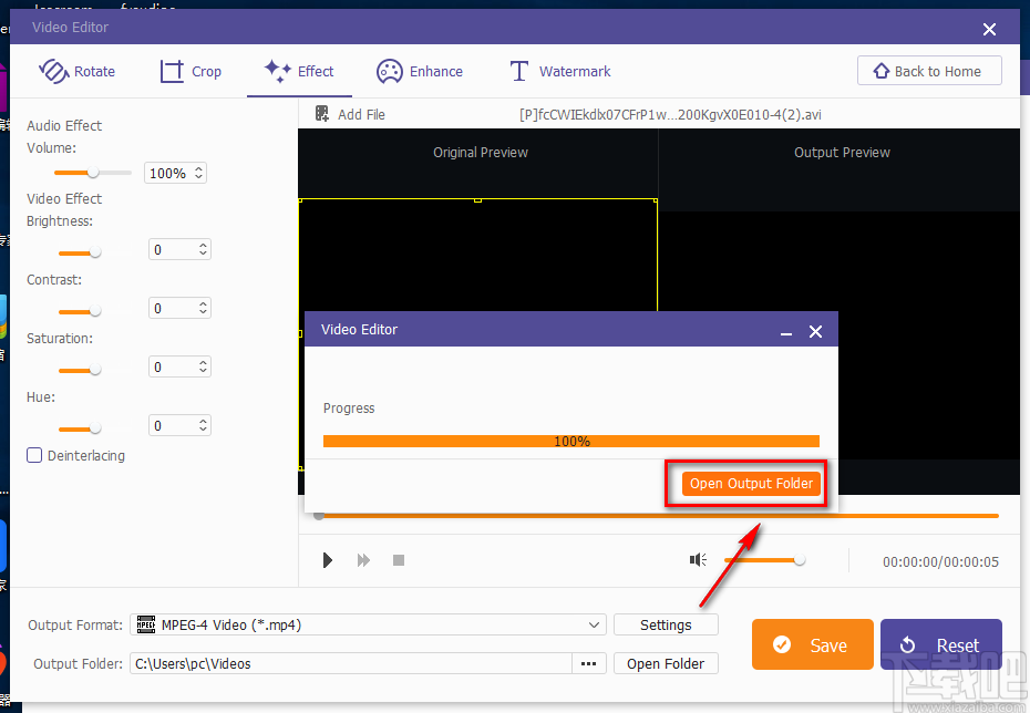9.调整视频饱和度的速度非常快,在执行任务过程中,界面上会弹出一个进度框;任务完成后,我们可以在进度框中查看到进度是100%;还可以点击框中黄色的“Open Output Folder”按钮打开存放目录对文件进行查看。
