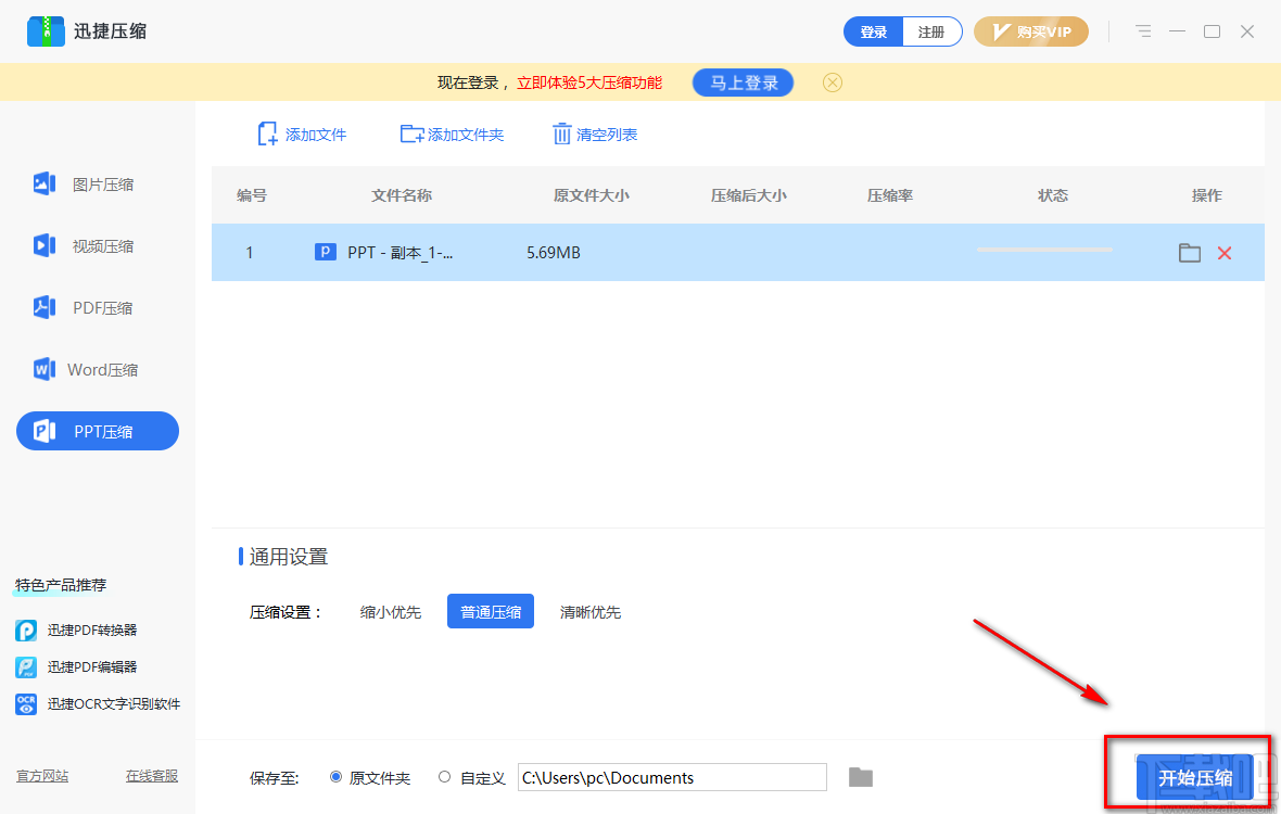 迅捷压缩是一款功能全面、界面简单清爽的文件压缩软件,该软件不仅给用户提供了图片压缩、视频压缩、PDF压缩的功能,同时还支持PPT压缩、Word压缩,不仅压缩速度快,压缩效率也很高。我们都知道,PPT文件内容大都是文字加图片以及视频组成的,所以PPT文件相对于其他文本格式的文件来说,体积比较大,占用电脑内存也比较多。如果想要给电脑腾出更多的磁盘空间,我们就可以使用这款软件来压缩PDF文件。那么接下来小编就给大家详细介绍一下迅捷压缩软件压缩PPT文件的具体操作方法,有需要的朋友可以看一看。